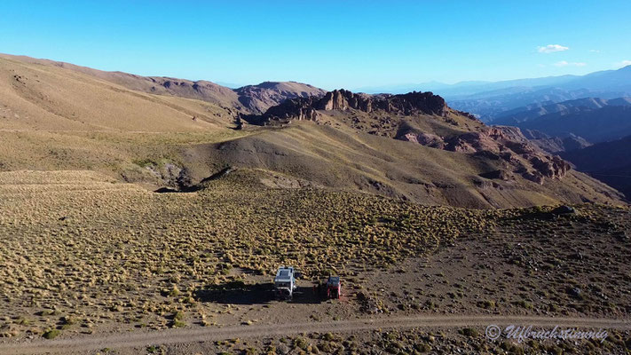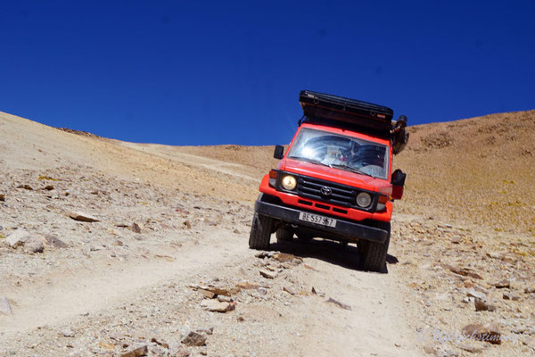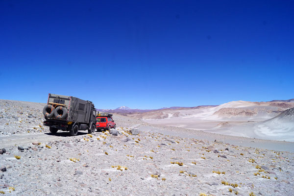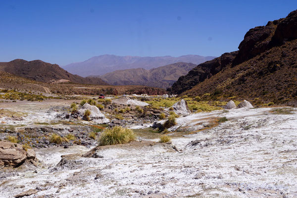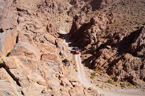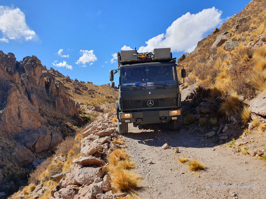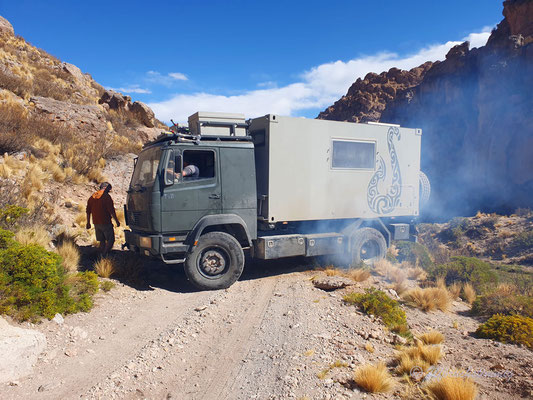 Las Papas. Hier gibt es heisse Quellen - die einen wollen wir anfahren. Aber bald schon wird die Strasse eng und sehr steil. Vor allem für den Truck ist es ein "Fahren am Abgrund" und die