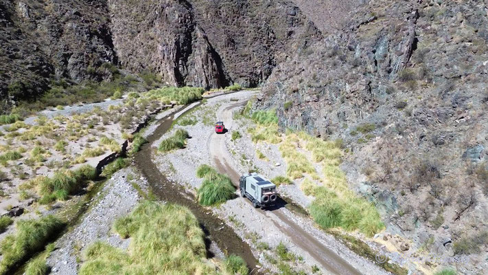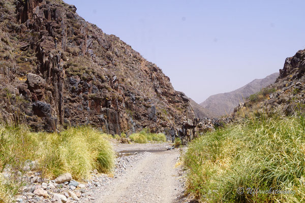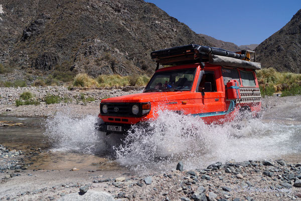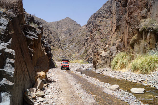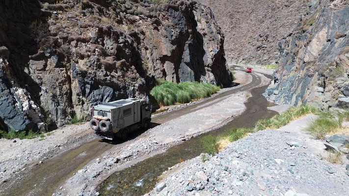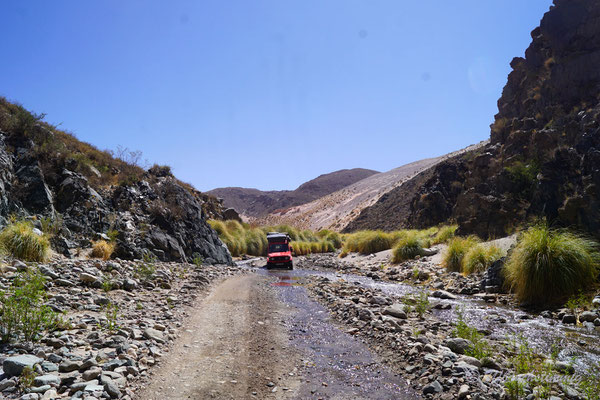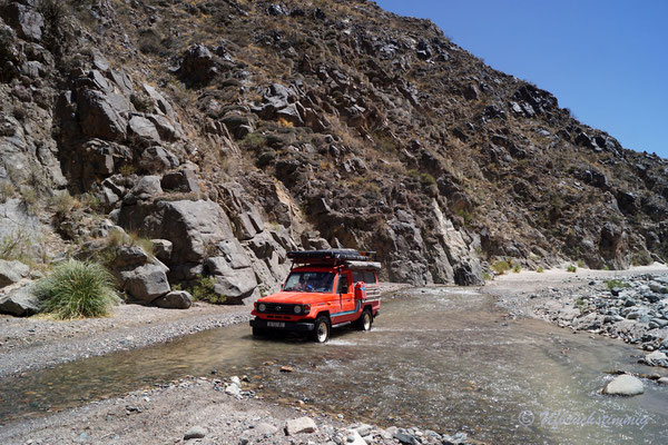 Nach dem Dorf Las Papas kommen wir in das berüchtigte Flussbett - die Strasse führt hier unzählige Male durch den Fluss. Von anderen, zählfreudigen Reisenden hören wir, dass es über 100