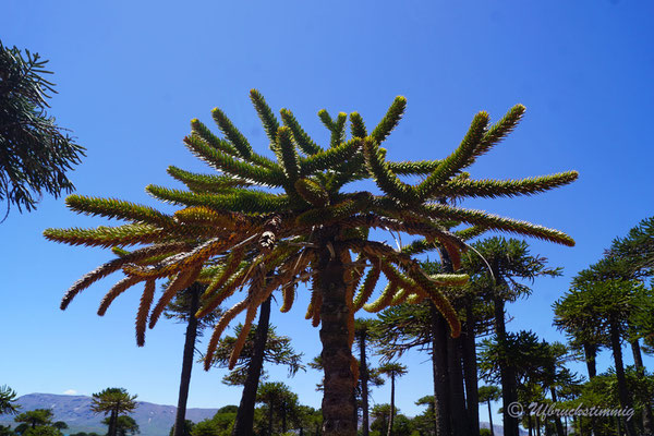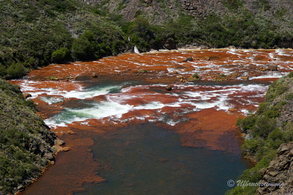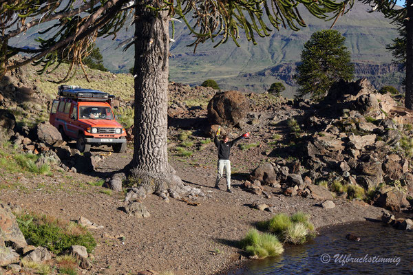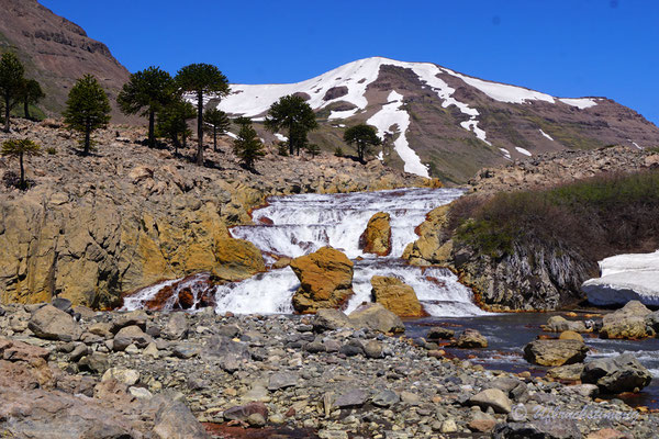 Nach Chos Malal verlassen wir dann definitiv die RN40 für eine Zeit. Wir fahren über die 21, dann über die 27 auf die 26 nach Caviahue. Hier liegt eine grandiose Region - voller Wanderwege und wunderschönen Naturschauspielen, wie zum Beispiel der rote Wasserfall "Salto del Agrio". Daneben gibt es ganze Thermal-Quellen-Dörfer/ Kurorte und die Landschaft ist geprägt von den typischen Araukarien Bäumen Patagoniens. Hier geniessen wir ruhige Tage und einige Wanderungen in dieser wunderbaren Landschaft.