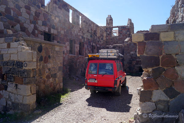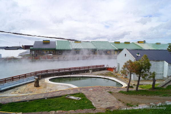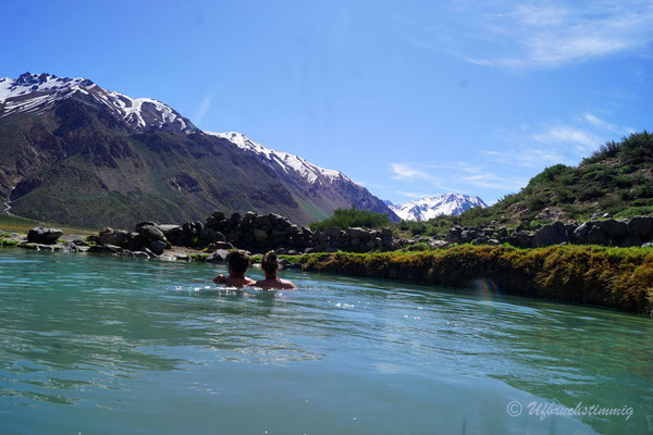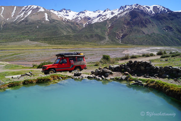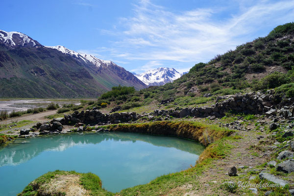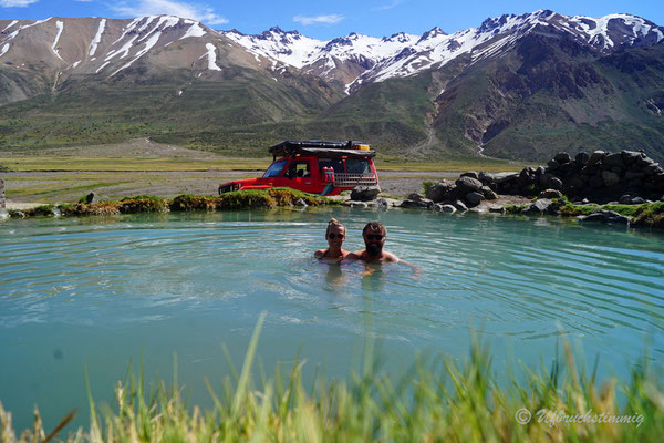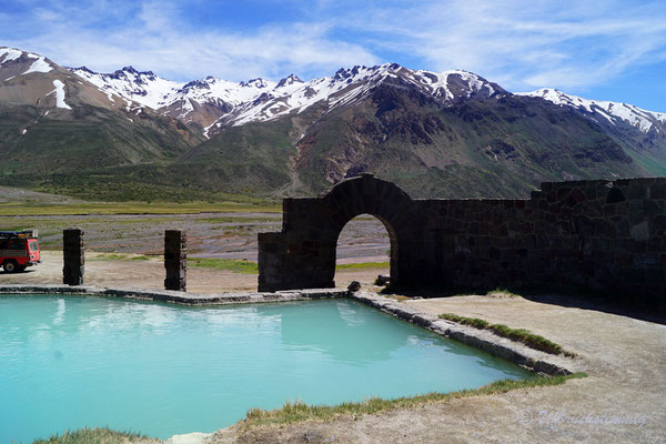 Neben der "offiziellen Routa 40" nehmen wir immer wieder Abstecher in Angriff. Wir fahren die alte Routa 40 - von Pareditas nach El Sosneado, die heutige RP 102. Auch von dieser Piste finden wir weitere Abstecher und fahren kurz südlich von La Jaula weiter in die Canyons hinein und gelangen so "hinten rum" ins Tal vom Rio Atuel. Die 220 bis ganz nach hinten ins Tal vom Rio Atuel verfolgen wir ebenfalls soweit es geht. Das Tal hat scheinbar mal mehr Tourismus gesehen. Als absolutes Highlight neben der Landschaft gibt es hier ein verlassenes Thermal-Hotel, wo man die Becken bis heute nutzen kann. Allerdings ist das Wasser relativ kühl geworden - gerade noch so knapp als warm zu betiteln. Aber natürlich lassen wir uns das Bad in einem "lost place" Hotel nicht nehmen.