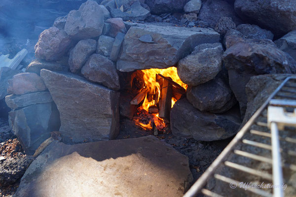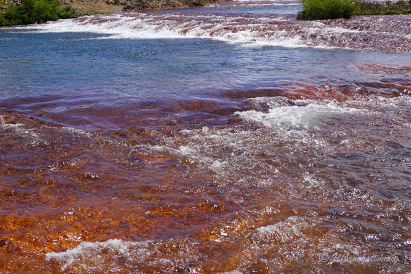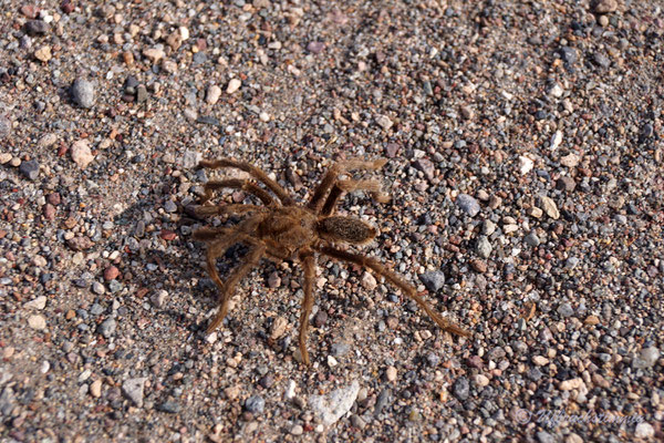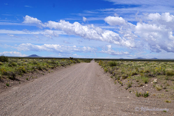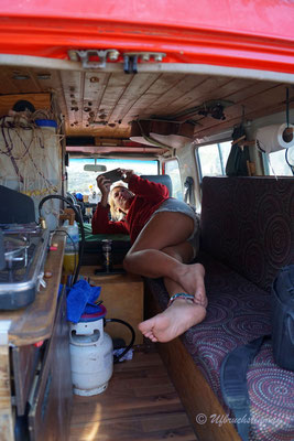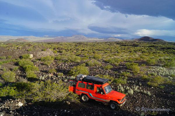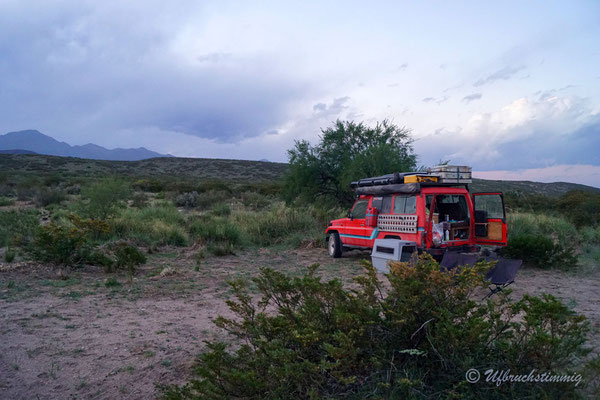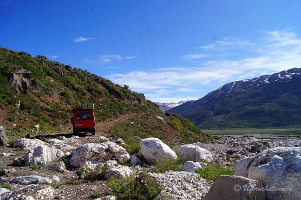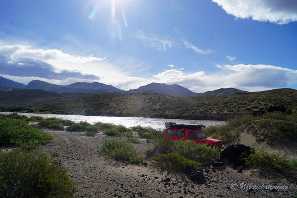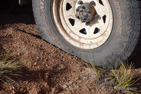 Um nicht immer auf teuren Zeltplätzen zu stehen (entlang der 40 sind sie wiiiiirklich teuer!!!) stellen wir uns auch mal an Dorfränder oder in trockene Flussbette... Und hier passiert es nun: Am Morgen werden wir von Wasserplätschern geweckt - mitten im ausgetrockneten Flusslauf. Waaaas? Rausgeschaut und wir sehen gerade noch die Wasserzunge am Auto vorbei laufen und hinten fliesst ein Bächlein, wo absolute Trockenheit geherrscht hat. Wir springen so schnell es geht vom Dachzelt runter, packen alles in Eile zusammen. Fahren raus aus dem Flusslauf... Wir wissen ja nicht, wieviel und wieso hier plötzlich Wasser fliesst.