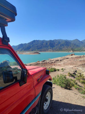 Stausee Potrerillos. Hier verbringen wir den letzten gemeinsamen Abend zu sechst - mit ein paar Flaschen Wein; vielleicht auch einer zu viel. ;-) Leicht verkatert am nächsten Morgen bricht